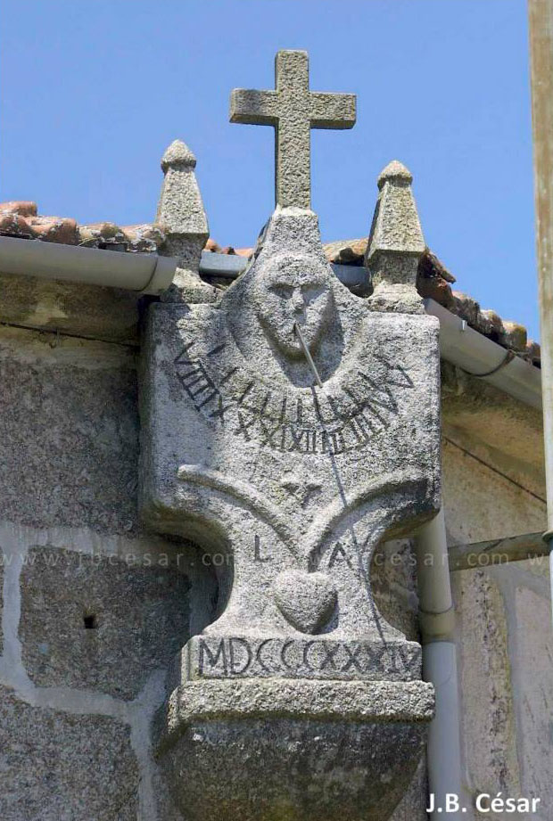 Curioso relógio de Sol em granito, com numeração romana. O gnómon sai da boca de uma cabeça humana. Está datado de 1834.